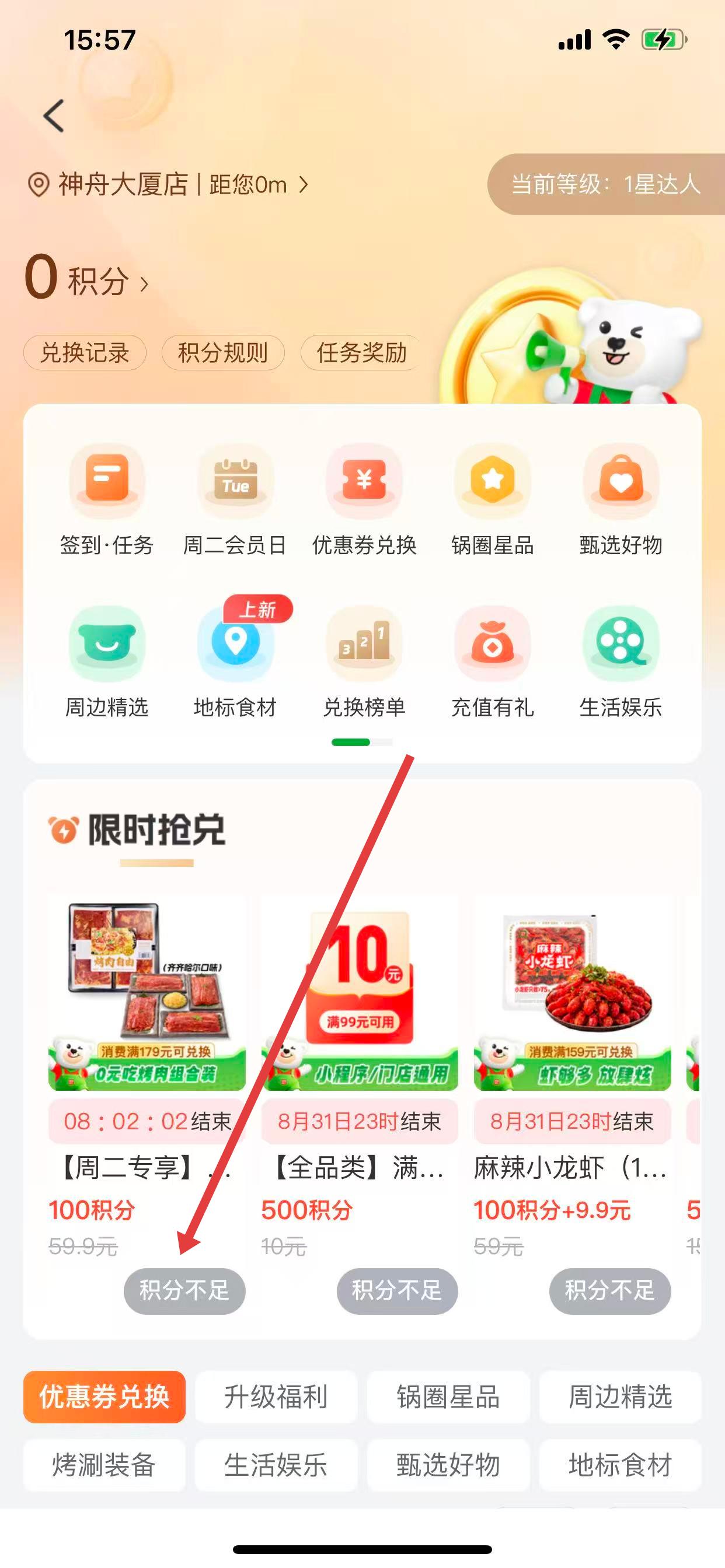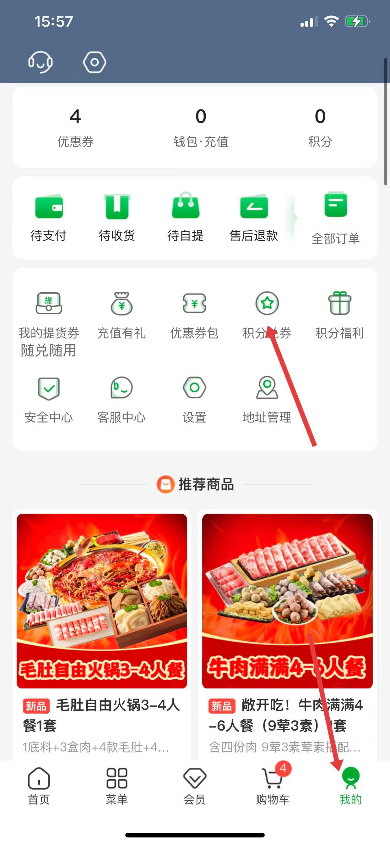 1、打开锅圈小程序或APP,进入我的选项,找到并点击积分兑券选项。