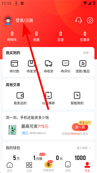 2、在个人中心页面点击登录注册区域,进入登录操作界面。