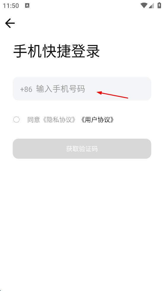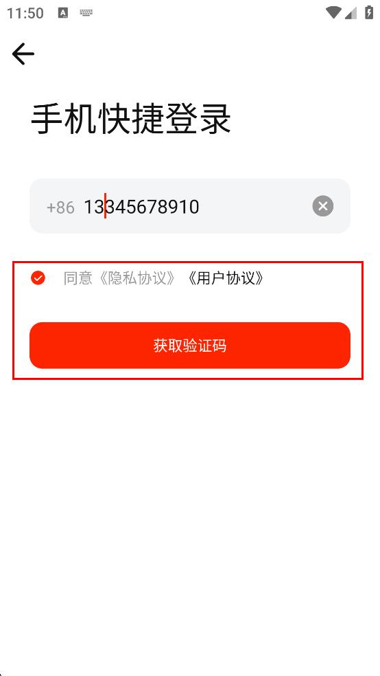 4、填写好手机号码后,勾选同意隐私协议,用户协议,然后点击“获取验证码”按钮,等待接收验证码,后续输入验证码即可完成登录。