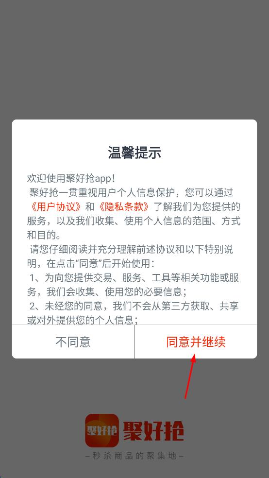 1、打开聚好抢app,会弹出温馨提示页面,提示可通过用户协议和隐私条款了解服务及个人信息相关情况,仔细阅读后,若同意,点击“同意并继续”按钮。