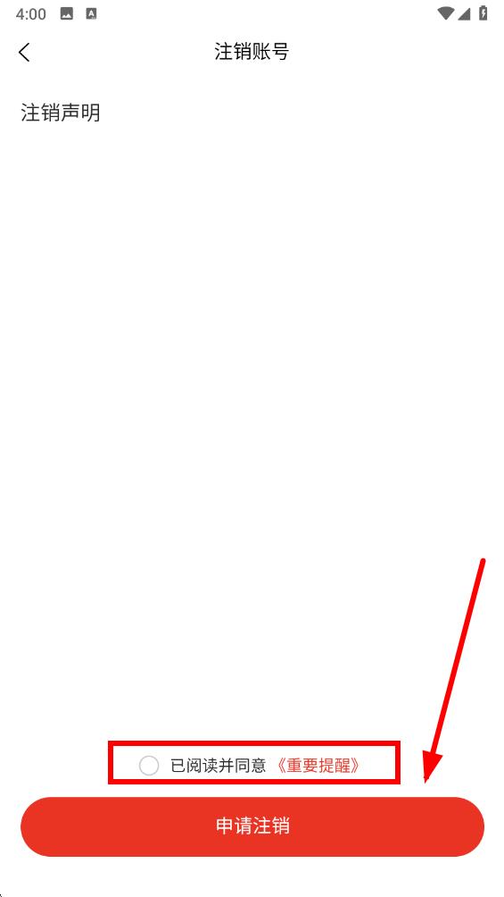 3、进入注销账号页面后,确认无误后勾选已阅读并同意,最后点击申请注销按钮完成账号注销流程。
