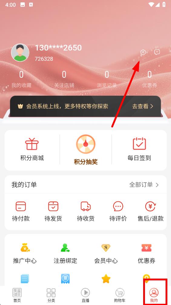 1、打开美宸健业app点击底部导航栏中我的选项进入个人页面,在页面右上角找到并点击设置图标。
