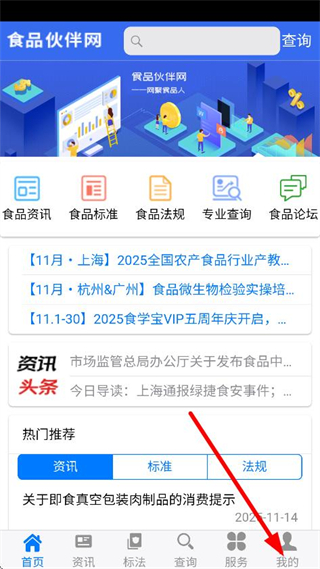 1、在食品伙伴网首页,点击底部我的,进入个人页面。