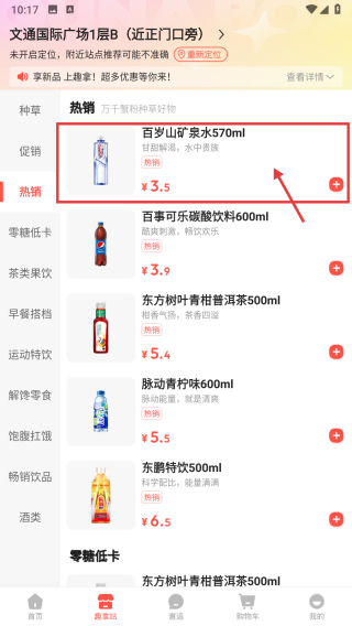 3、在热销商品列表中,点击百岁山矿泉水570ml商品,进入商品详情页。