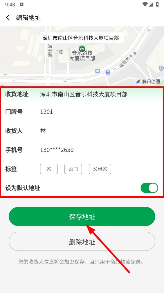 4、在编辑地址页面,修改收货地址、门牌号、收货人、手机号等信息,确认无误后点击保存地址按钮,即可完成收货地址的修改。