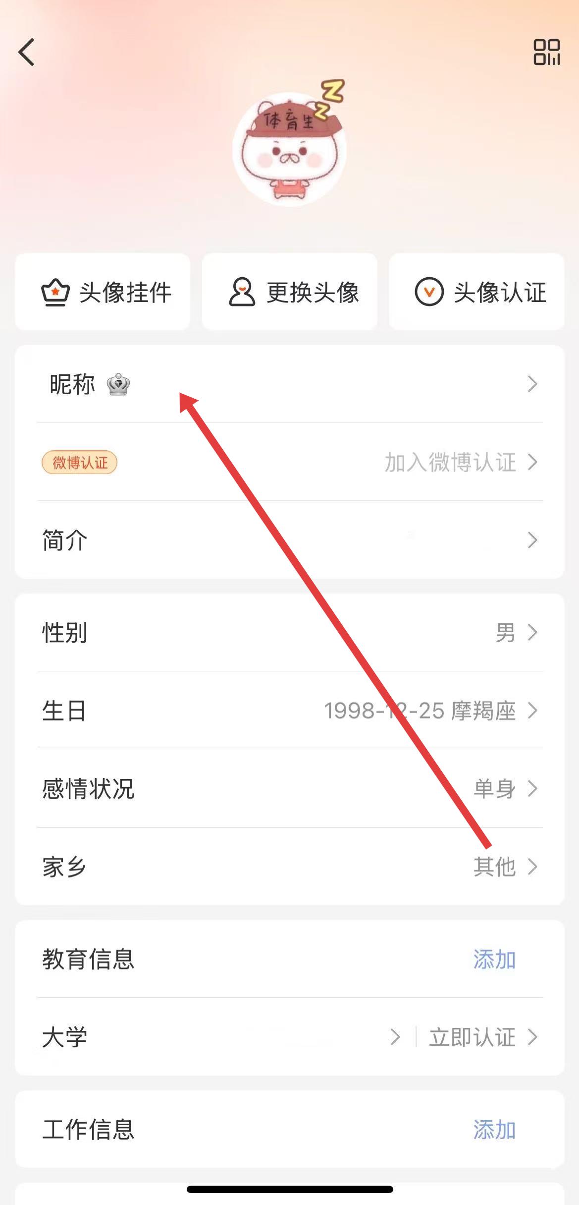 3、进入个人资料编辑页面后,点击昵称选项,进入昵称修改页面,进行修改并保存。