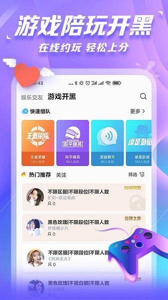【开黑语音】业界实时语音技术,根据你的风格匹配高颜值游戏大神,更有游戏开黑房间,随时随地体验娱乐互动。
