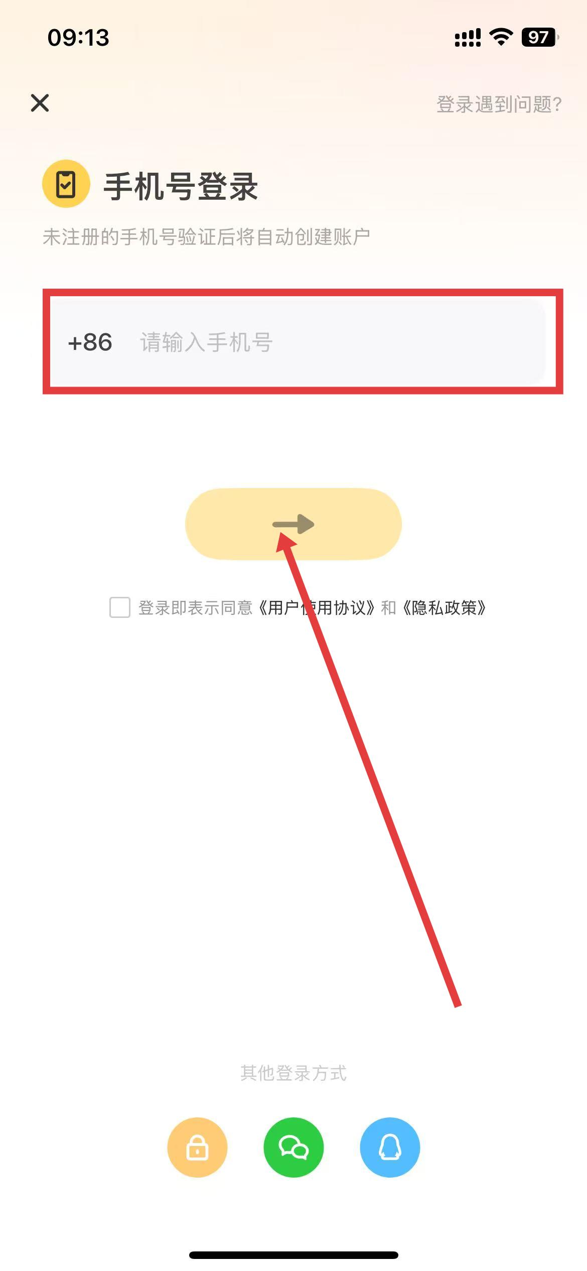 3、输入要登录的手机号,点击下方的箭头按钮。