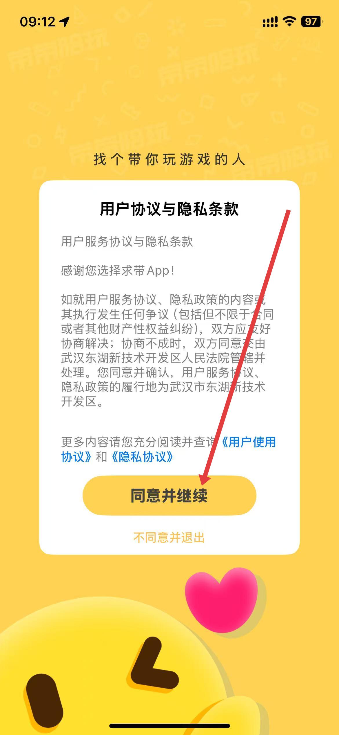 1、打开app,在弹出的页面,点击同意并继续按钮。