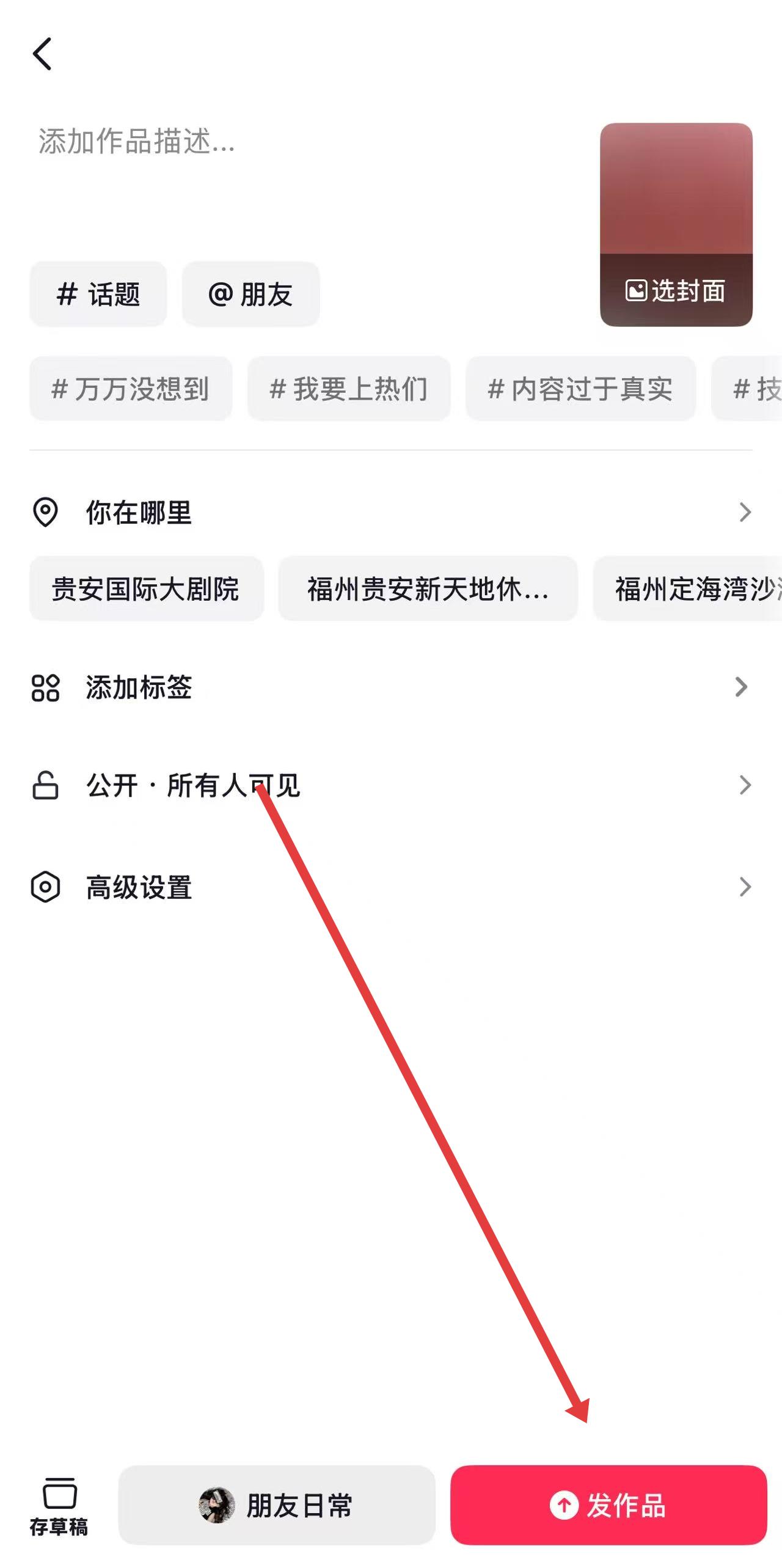 3、确认设置无误,点击发作品,即可将创作的内容发布到抖音平台,分享给粉丝与其他用户,开启互动传播。