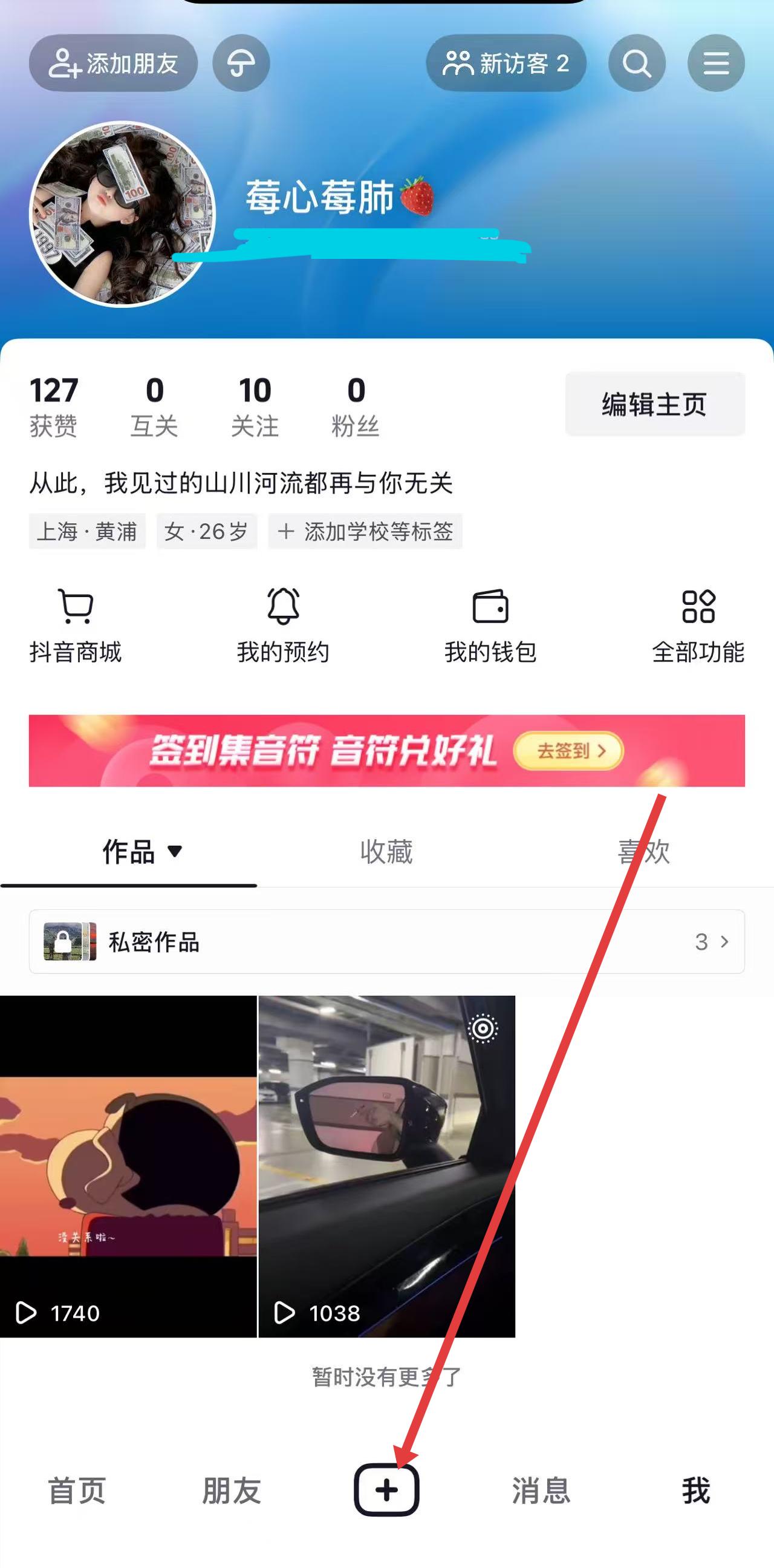 1、在抖音个人页,点击底部加号,进入拍摄/上传界面,创作视频内容,添加音乐、特效等创意元素。