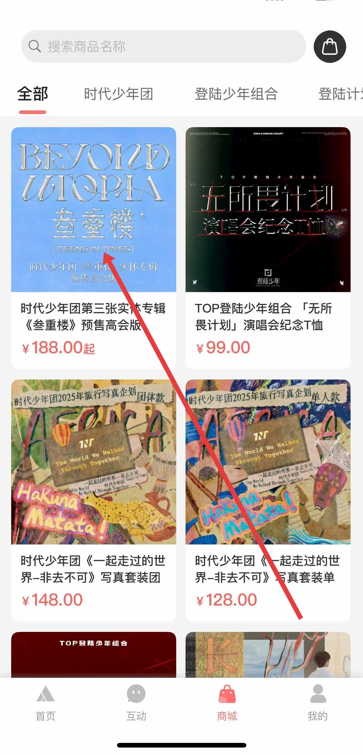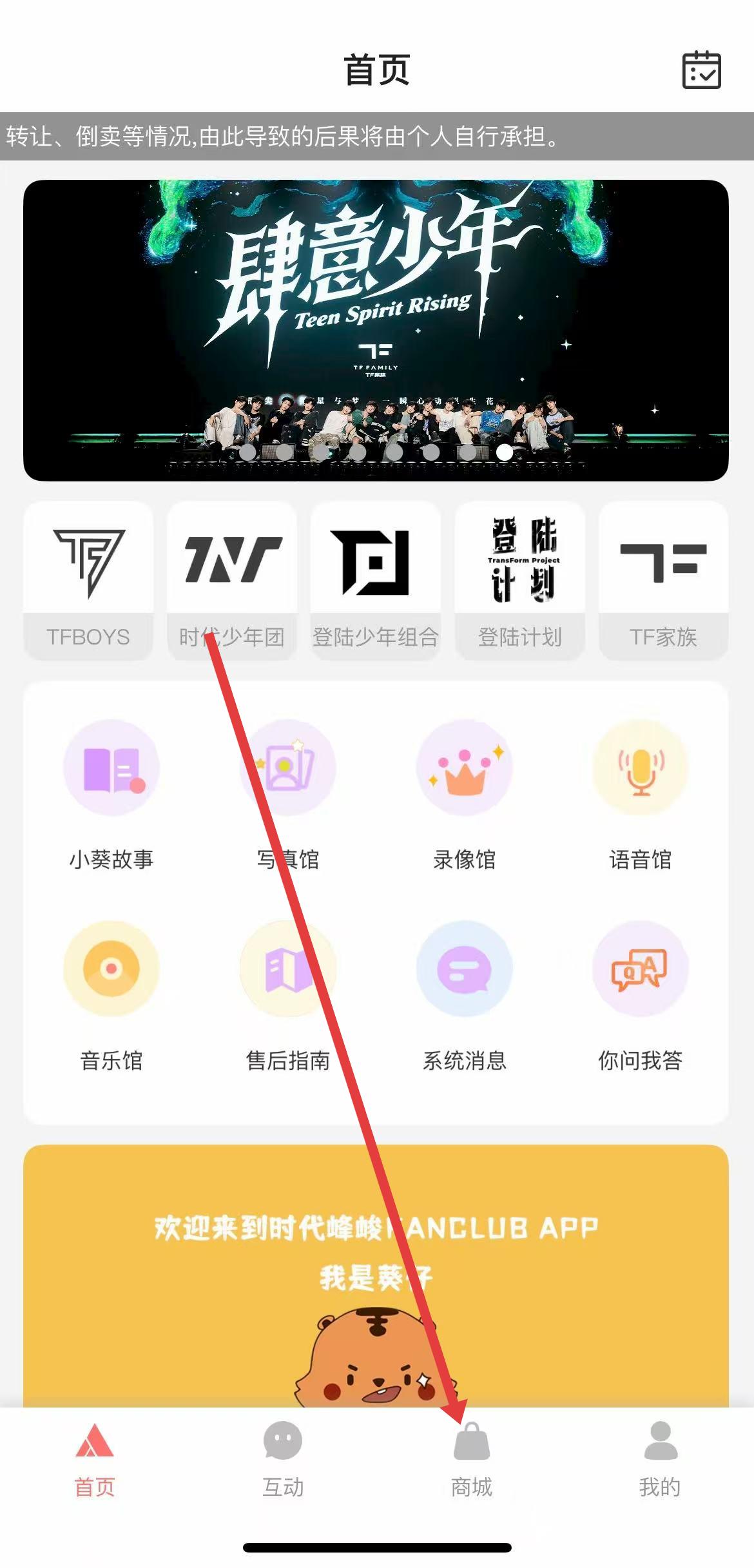 1、打开TF家族FANCLUBAPP,在首页底部导航栏中找到商城选项,点击进入。