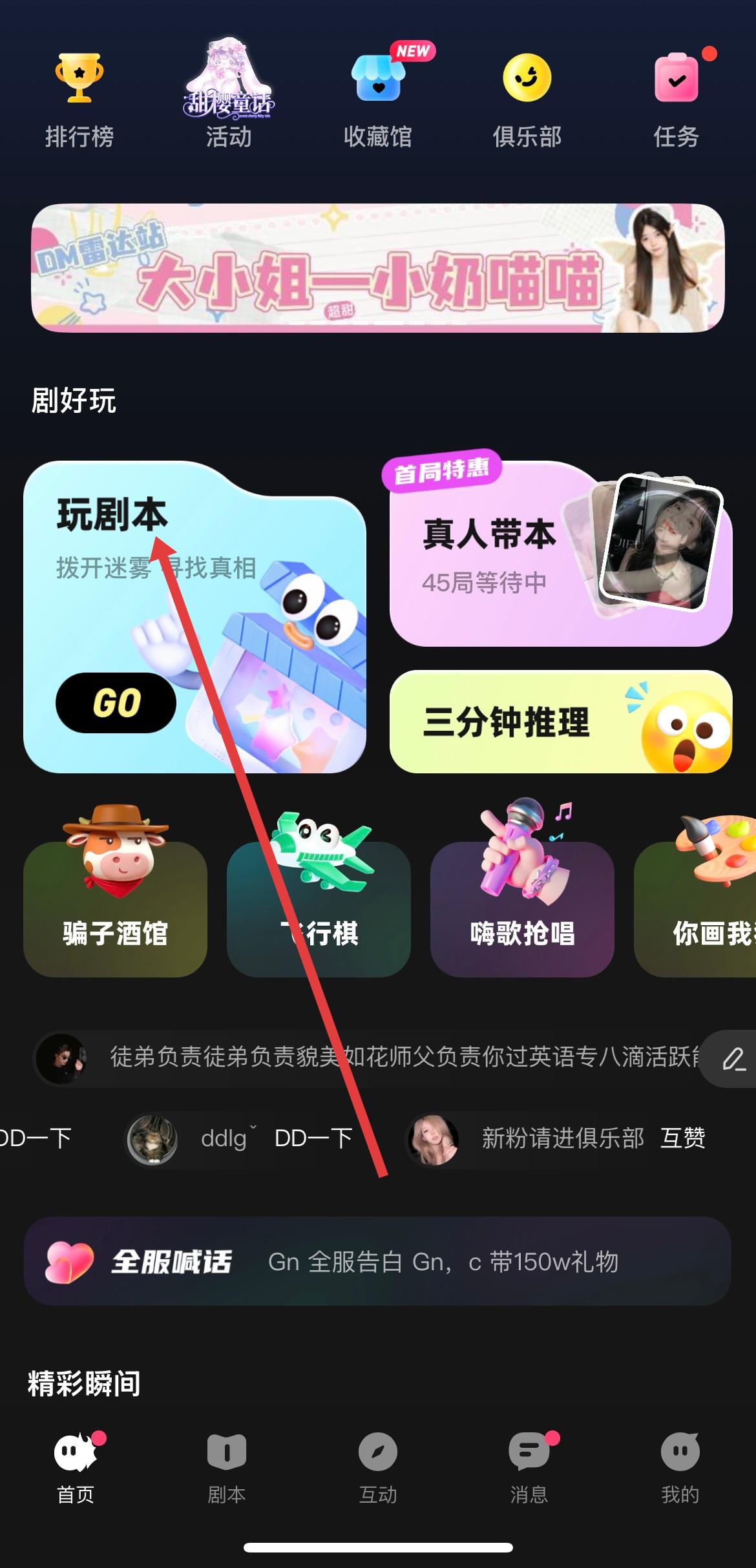1、打开百变大侦探APP,进入首页后找到剧好玩板块,在该板块中点击玩剧本选项,即可进入组局页面。