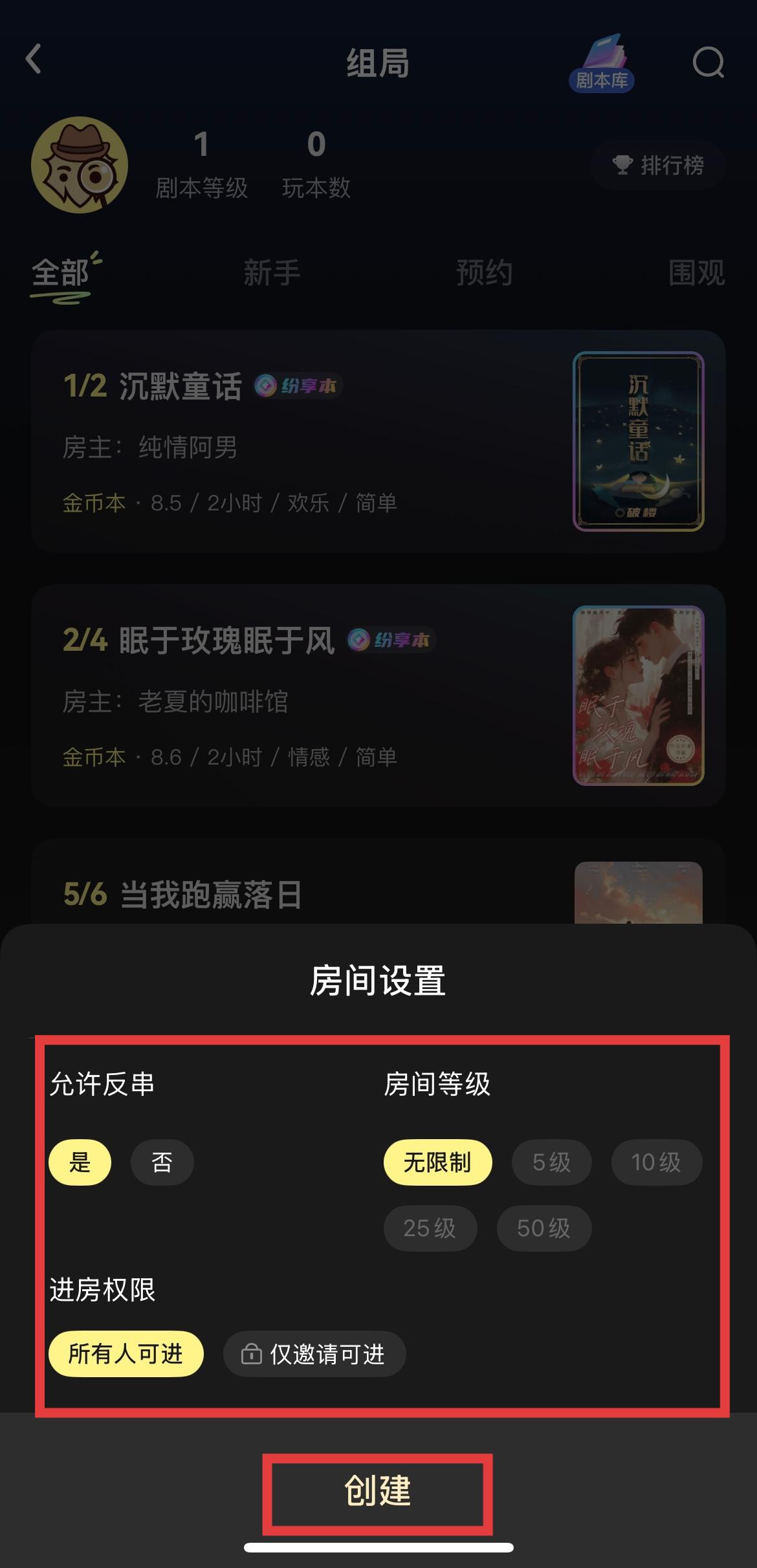 3、之后会弹出房间设置界面,在这个界面里需要选择允许反串、房间等级、进房权限等各项参数,完成选择并确认无误后,点击创建按钮,就能成功创建出剧本杀房间。