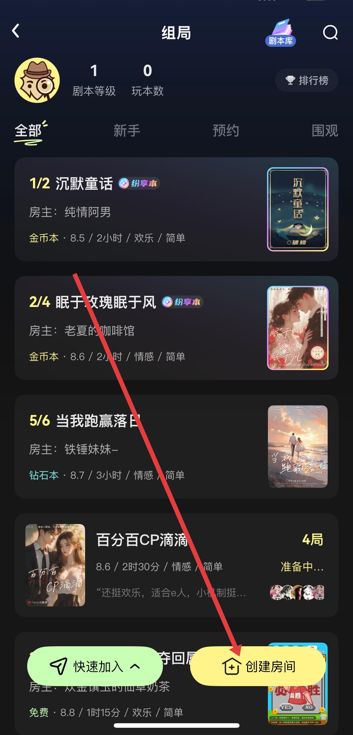 2、成功进入组局页面后,在页面的右下角位置可以看到创建房间按钮,点击该按钮后,就会开启房间设置的相关流程。