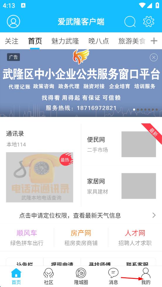 1、打开爱武隆客户端,点击页面右下角“我的”选项,进入个人中心页面。