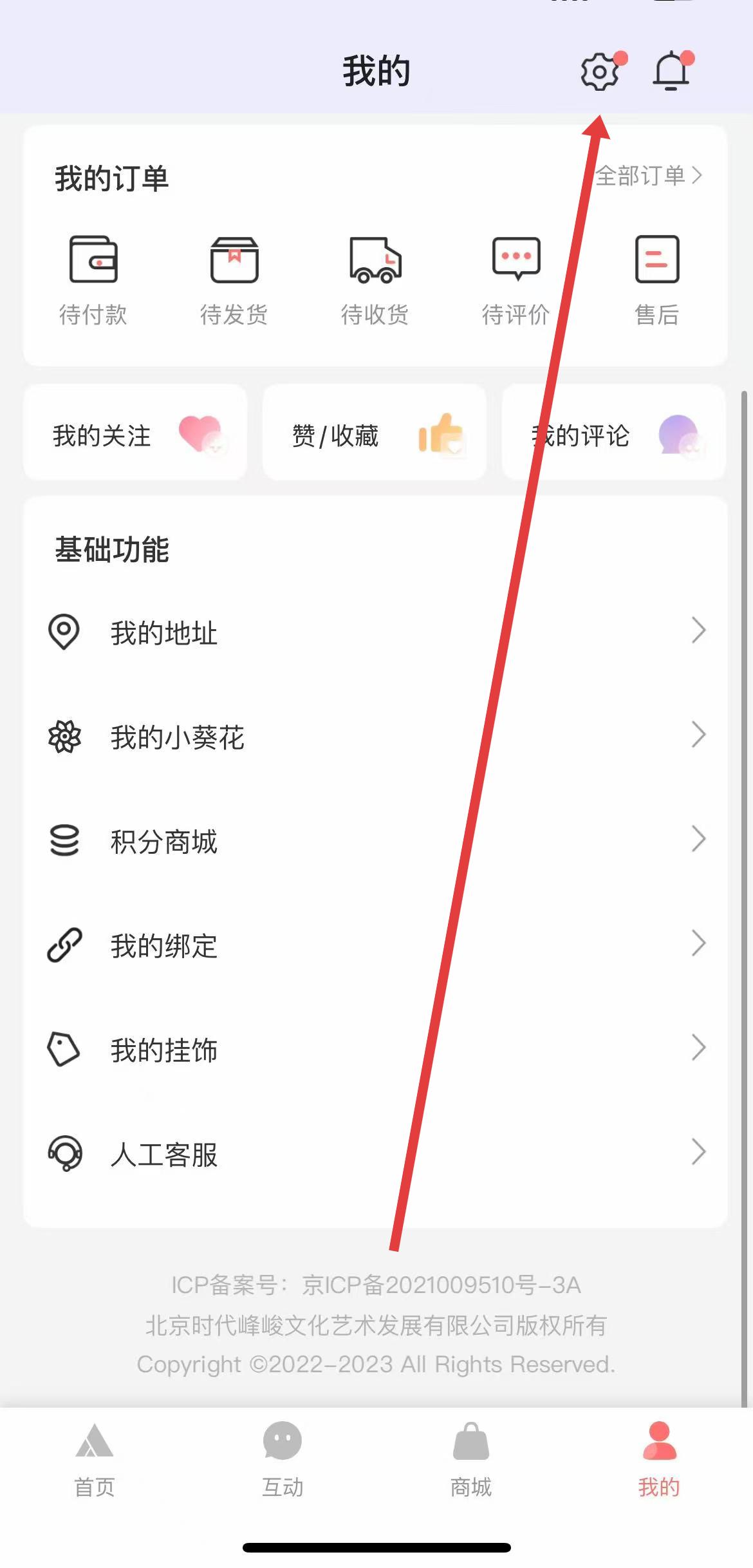 1、打开TF家族APP,点击右下角我的,进入个人页面后点击右上角的齿轮状设置图标。