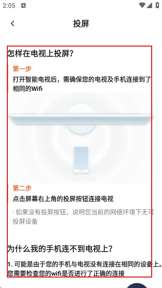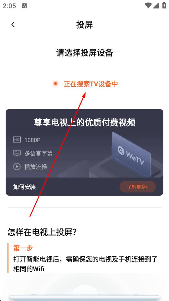 4、如果没有搜索到设备,可查看投屏页面下方怎样在电视上投屏?的指引,确认手机和电视连接到了相同的Wi-Fi。