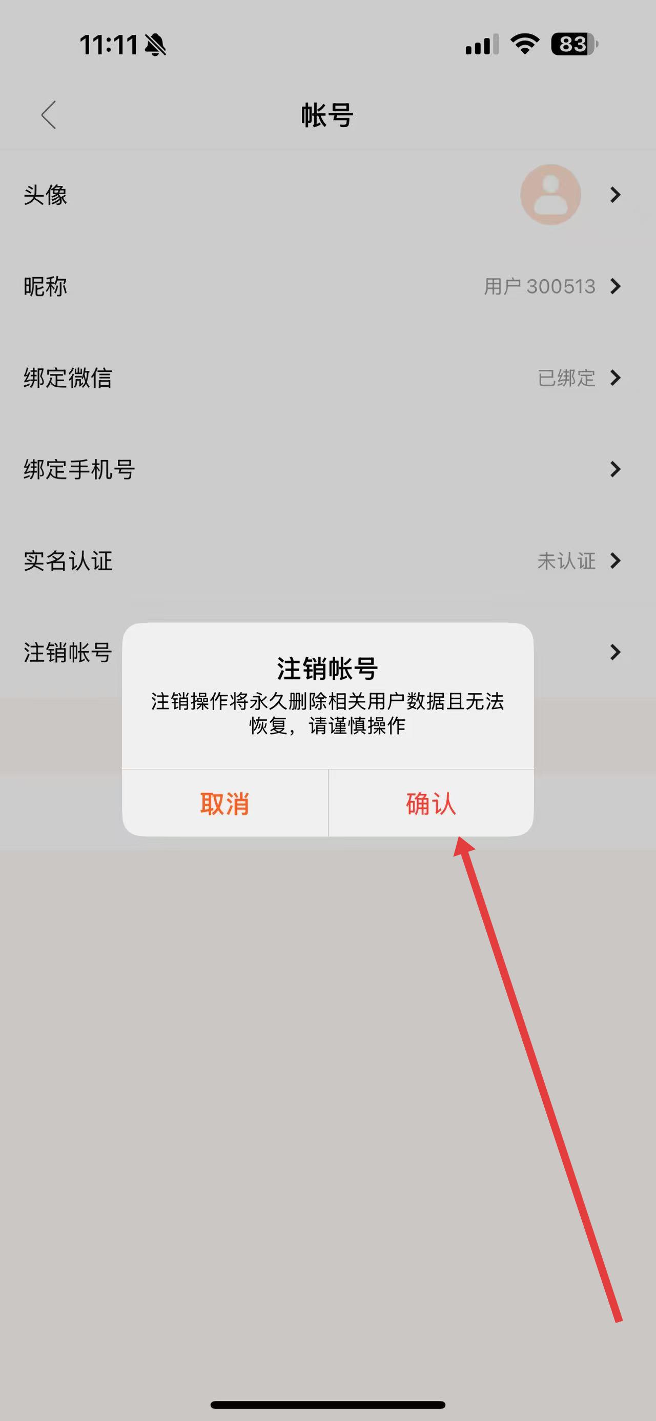 4、在弹出的确认提示框中,仔细阅读提示内容,确认注销操作将永久删除相关用户数据且无法恢复,点击确认,即可完成账号注销。