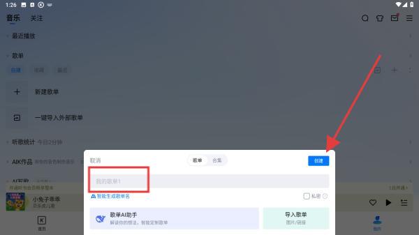 3、在弹出的新建歌单窗口中,输入歌单名称,然后点击创建的按钮即可。