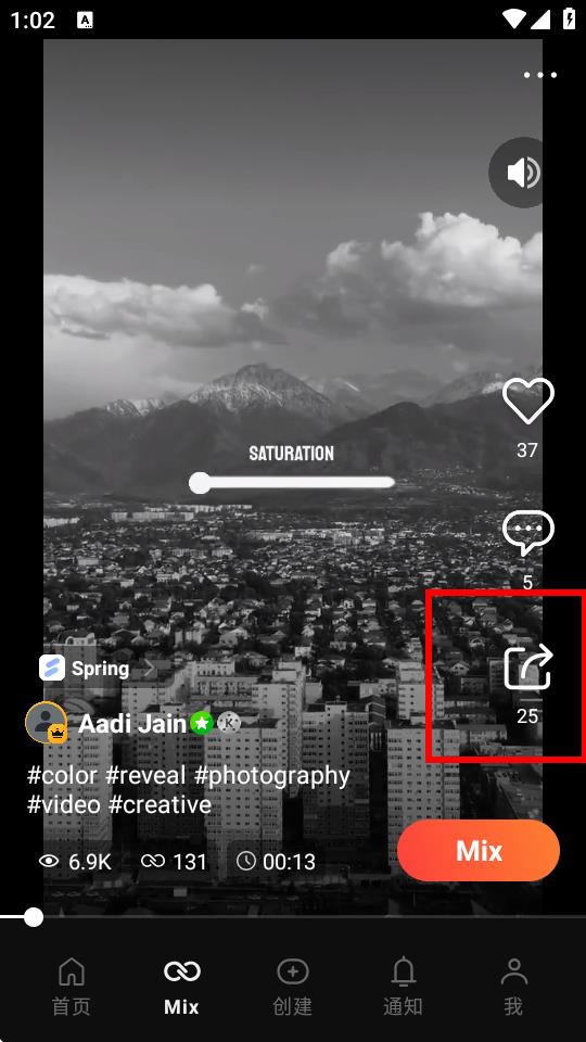 2、在Mix页面找到要分享的视频,点击视频界面右侧带有箭头的分享图标。
