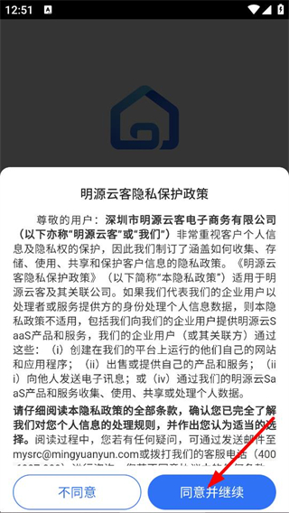 1、在隐私保护政策弹窗中,点击同意并继续,进入登录页面。