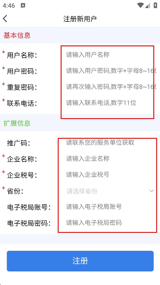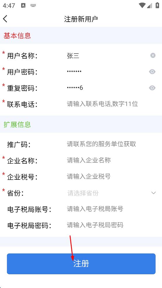 4、基本信息和扩展信息都填写完毕后,点击“注册”按钮,即可完成智云e票APP的注册操作。