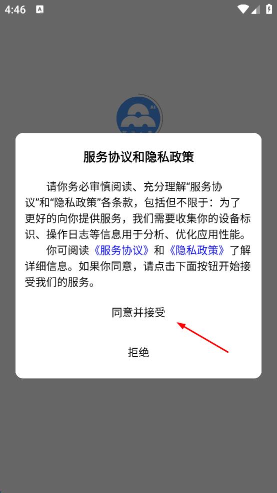 1、打开智云e票APP,会弹出服务协议和隐私政策提示框,仔细阅读相关内容后,点击“同意并接受”按钮,进入APP登录界面。