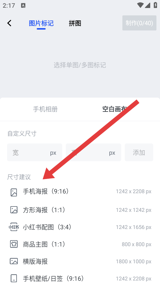 3、进入图片标记界面,可以在尺寸建议中选择手机海报9:16等预设规格,快速确定创作画布尺寸。