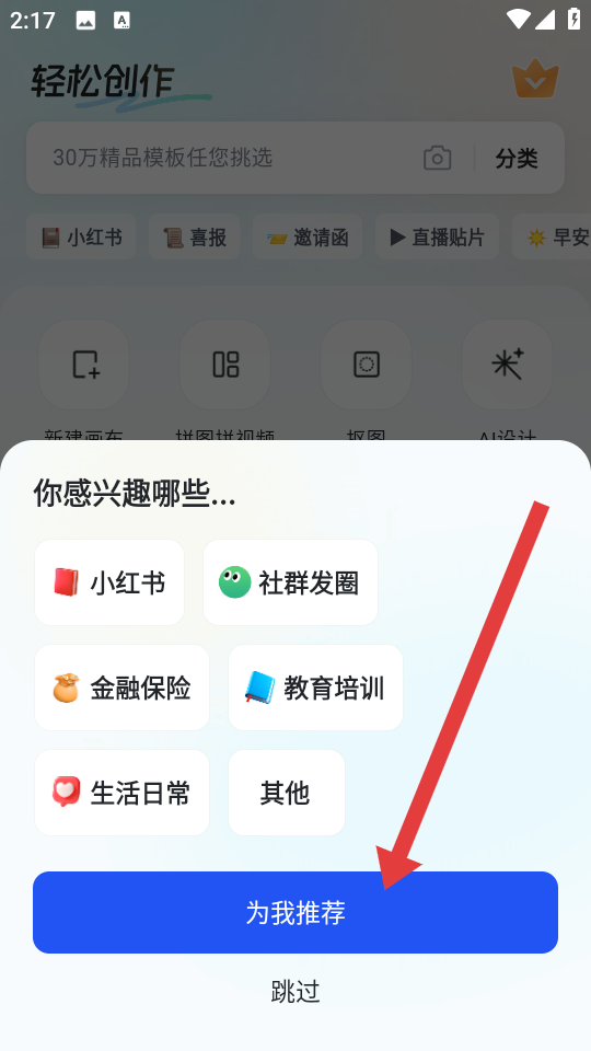 1、打开app后可以选择感兴趣领域后,点击为我推荐,获取平台依据兴趣定制的创作内容推荐。