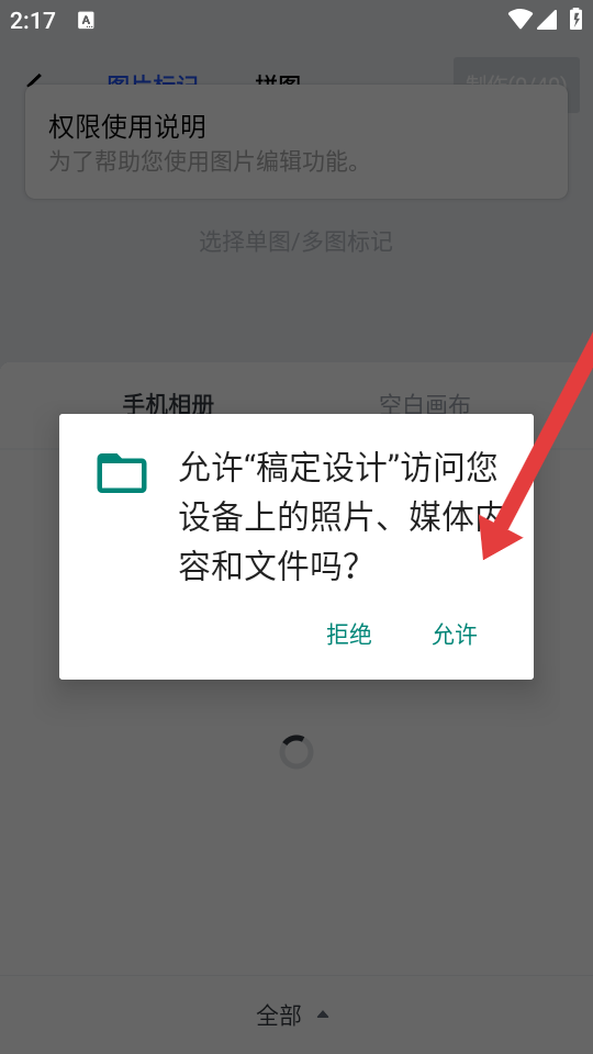 2、当应用申请访问权限时,点击允许,授权稿定设计访问设备照片、媒体及文件,以便使用图片编辑功能。