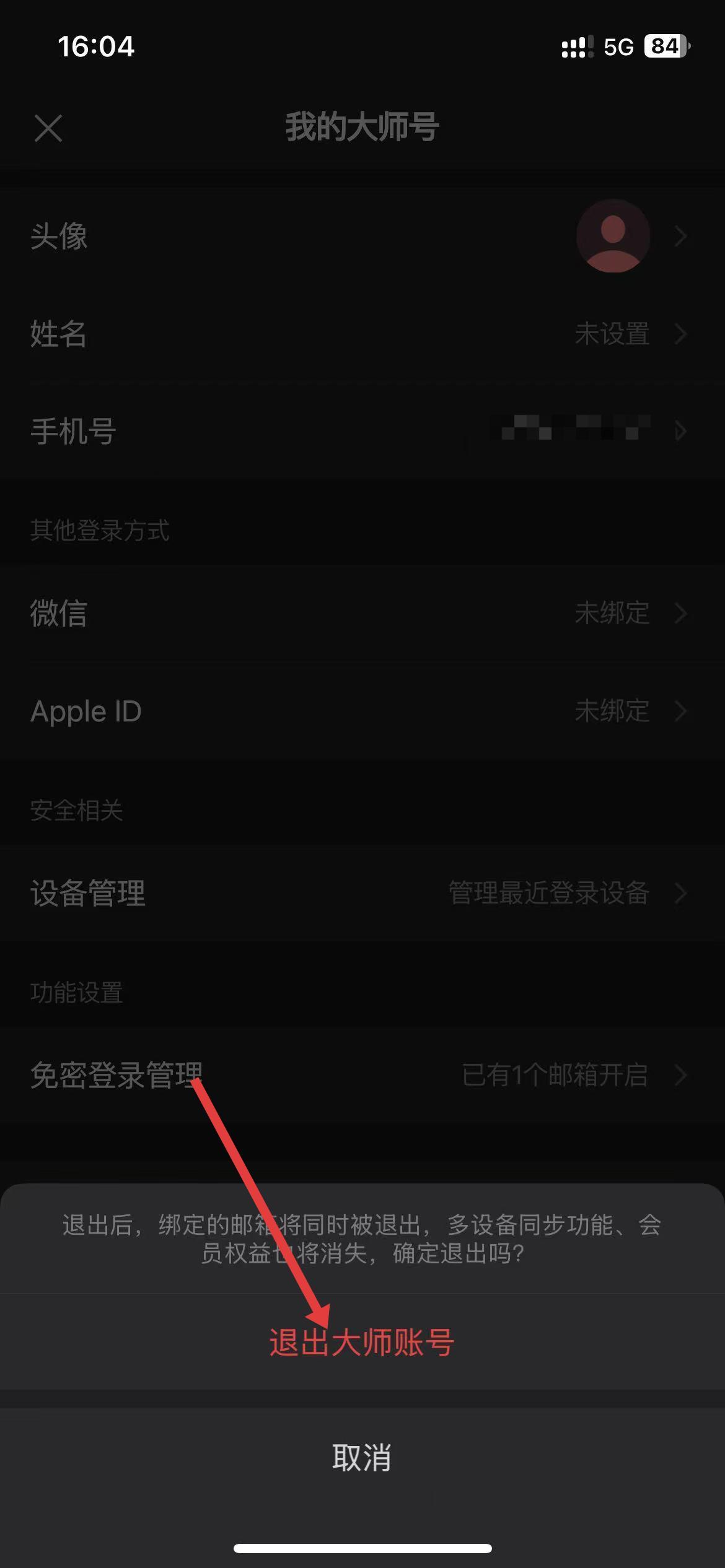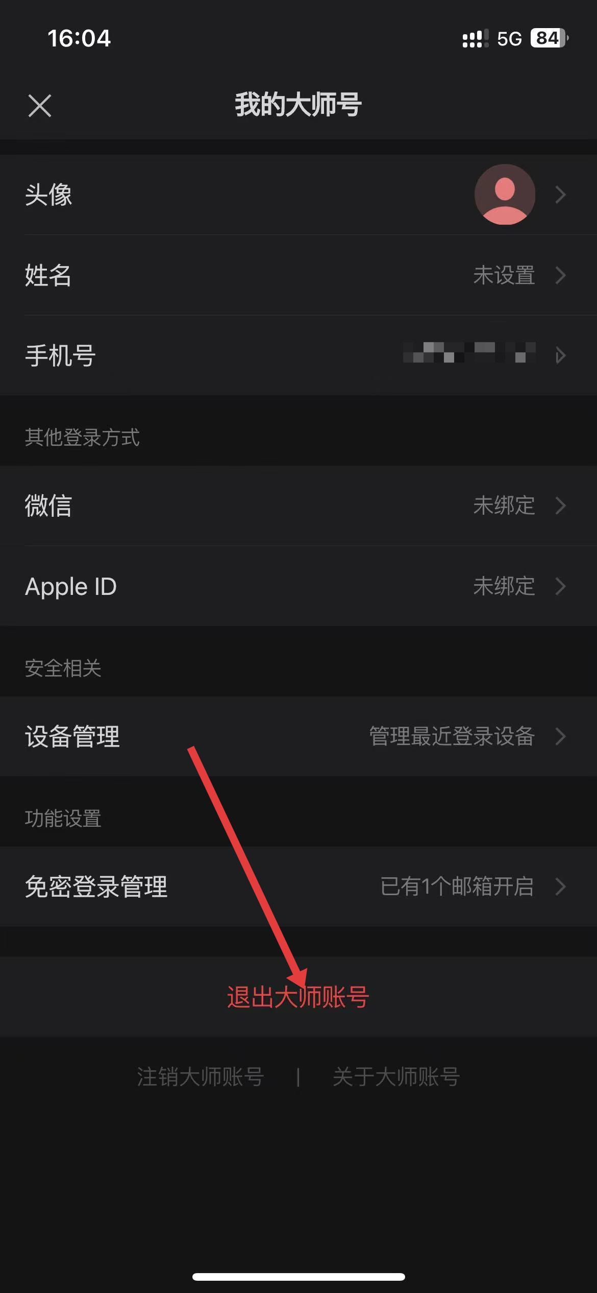 3、在我的大师号页面滑到底部,点击退出大师账号。
