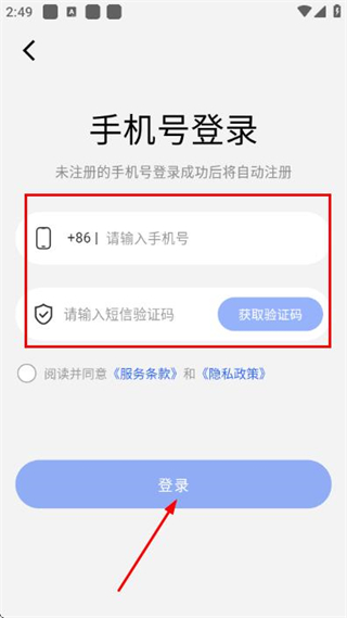 3、在登录页面填写手机号和验证码,勾选协议后,点击登录完成账号登录操作。