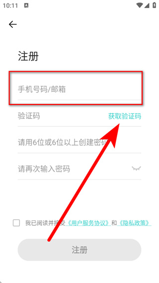 3、在注册页面,输入手机号码邮箱,点击获取验证码。