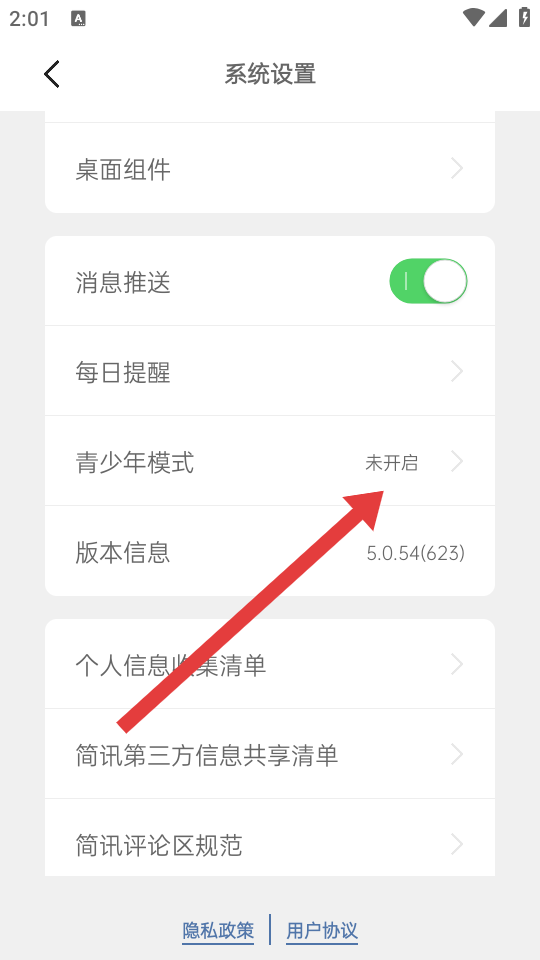 3、在系统设置界面,点击青少年模式,进入模式开启界面。