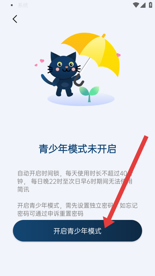 4、在青少年模式界面,点击开启青少年模式,即可开启该模式。