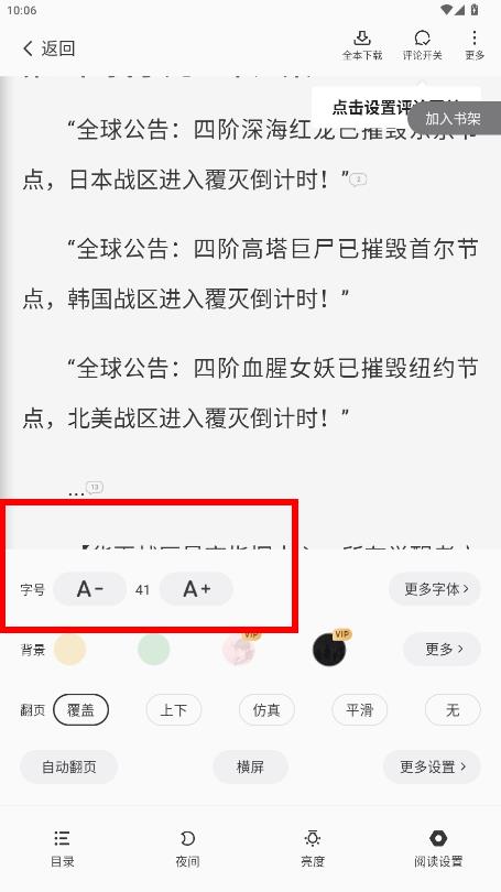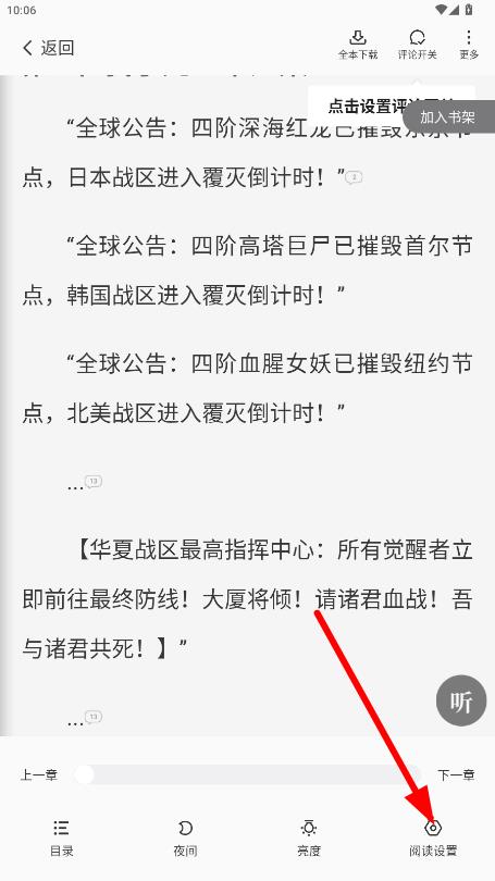 3、在阅读界面中,点击底部导航栏中的阅读设置选项。