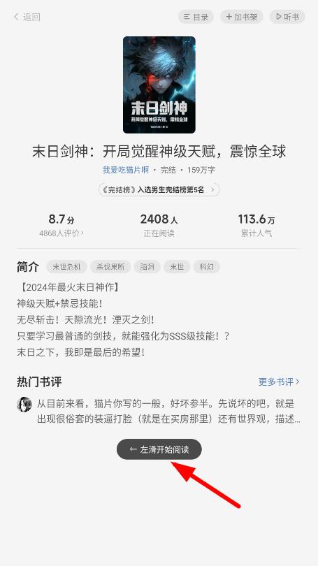 2、点击进入小说详情页,左滑开始阅读小说内容。