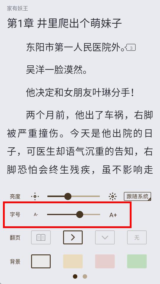 4、在阅读界面里,点击下方的设置Aa图标,在弹出的设置选项中,通过滑动字号对应的滑动条,即可调整字体大小。