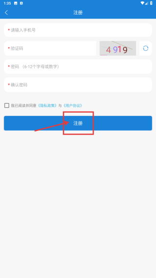 4、在注册信息填写页面,勾选同意隐私政策与用户协议后,点击注册按钮,完成账号注册操作。
