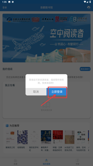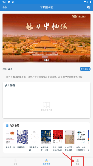 1、打开首都图书馆应用,点击底部书架选项,弹出登录提示框。