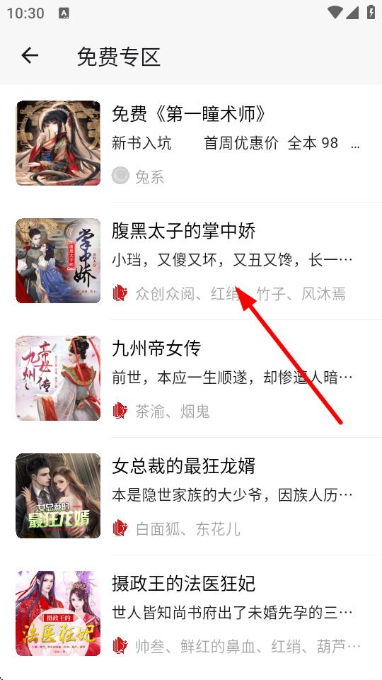 2、在免费专区中,选择想听的书籍,比如腹黑太子的掌中娇,点击进入书籍详情页。