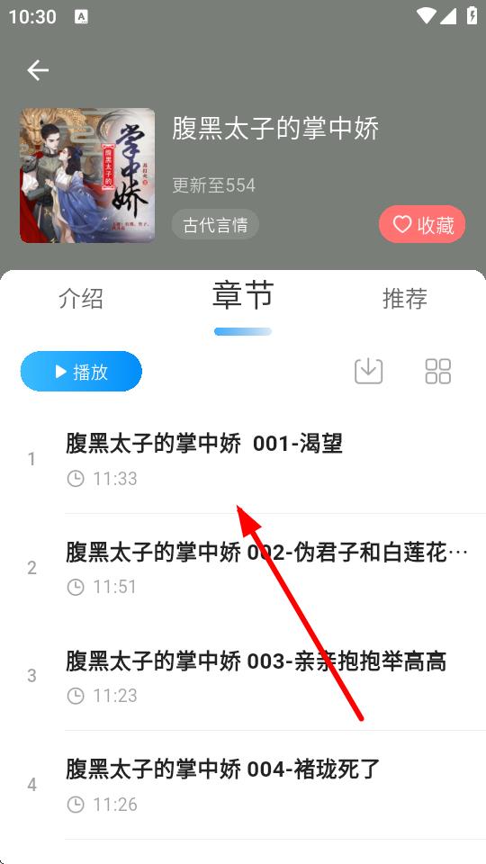 4、在章节列表里,点击想收听的章节,如腹黑太子的掌中娇001-渴望,即可免费收听该章节内容。