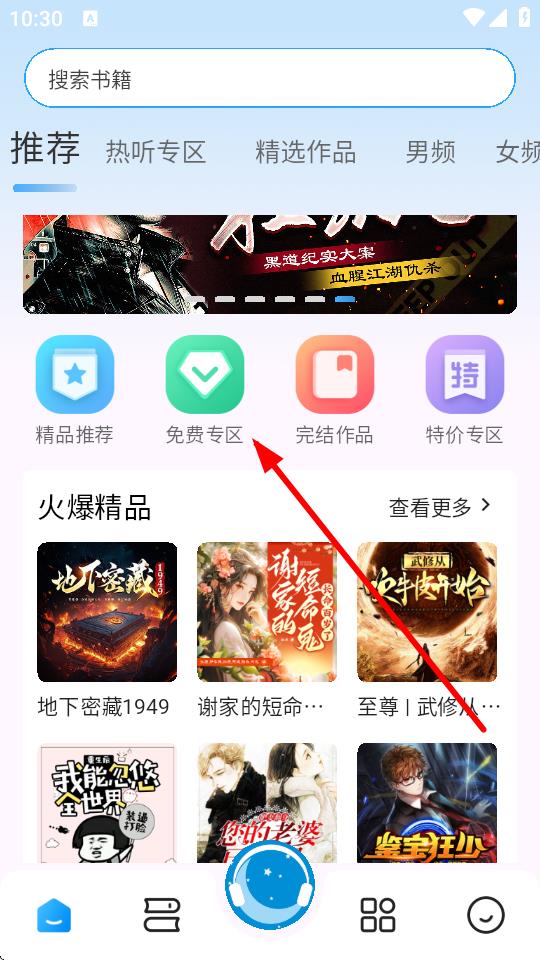 1、打开月亮听书APP,在首页点击免费专区选项进入免费书籍界面。