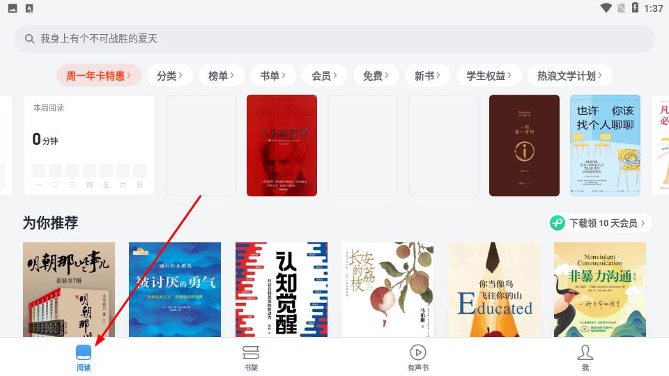 1、打开微信读书APP,点击底部【阅读】图标进入书库,可浏览为你推荐等板块挑选书籍。