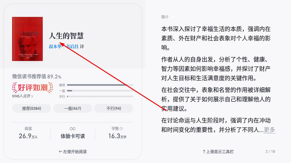2、找到目标书籍如【人生的智慧】,点击进入详情页,查看简介、评分及阅读数据,判断是否阅读。