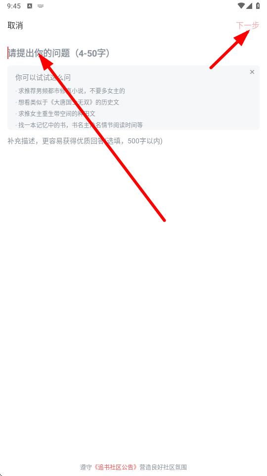 3、在提问输入框中输入问题4-50字,可选择补充描述,然后点击下一步提交问题。