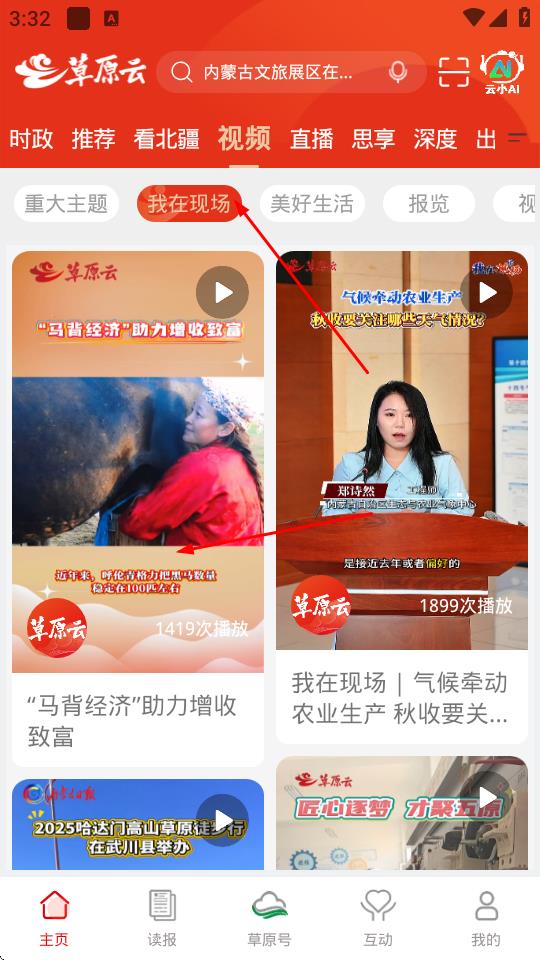 4、还能点击我在现场等分类标签,查看对应类别的视频内容。