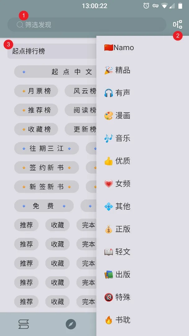 在顶部的搜索框搜索你要看的小说,并从多个网站提供的结果中选择一个点击开始阅读;或者点击发现,在导入的书源目录中寻找。