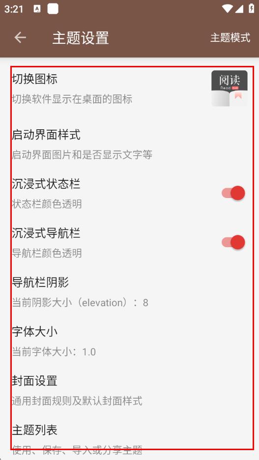 3、可以看到切换图标、启动界面样式、沉浸式状态栏、字体大小、封面设置等多项可调整的设置内容。